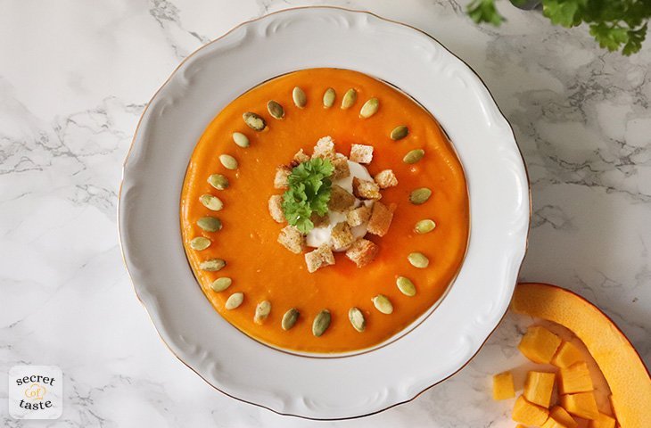 Aksamitny i rozgrzewający krem z dyni z nutką imbiru i kurkumy.Składniki